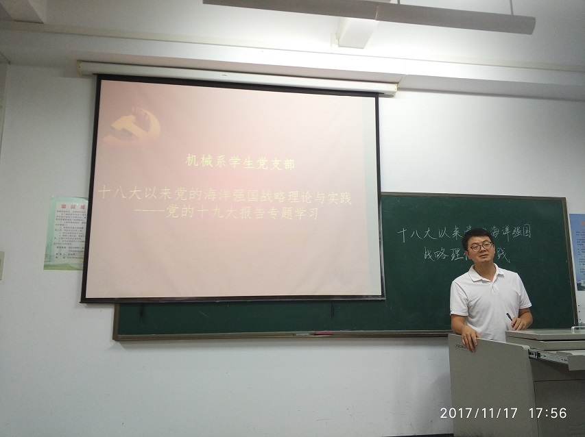 为了深入学习宣传贯彻党的十九大精神,增强新时代党员的理想意识、本领意识、担当意识,帮助党员同志进一步深刻理解党的十九大精神内涵,11月17日下午在4教206,机械系员工党支部邀请到马克思主义公司温小平老师作“党的十八大以来党的海洋强国理论与实践”为主题党的十九大专题报告会。机械系员工党支部书记崔建兵老师出席,全体党员、积极分子100多余参加专题学习。会议由支委赵琛主持。