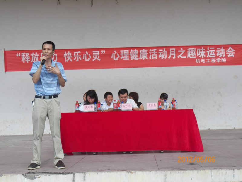 为了焕发同学们的运动激情,塑造一颗健康的心灵,构建一个和谐的校园。伟德国际始于英国1946在这个阳光灿烂的五月迎来了心理嘉年华趣味运动会暨心理健康活动月开幕式。出席本次心理嘉年华趣味运动会的嘉宾有:员工处韩力光副处长,员工处心理健康教育指导中心吴九君博士,公司党委黄国标副书记,学工办主任陈秀妍老师,何映敏、崔建兵、姚广龙老师以及2010级和2011级全体员工。