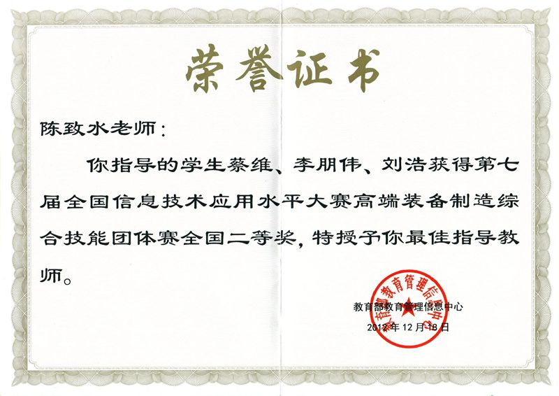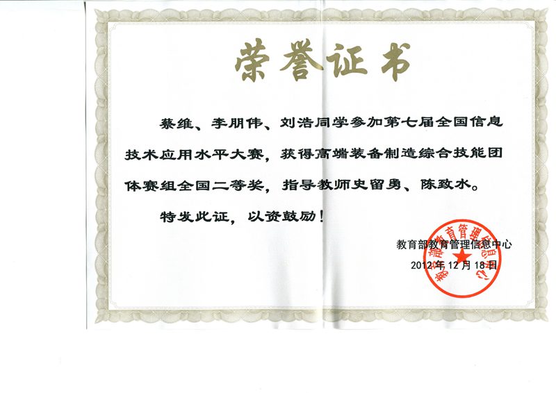 近日,伟德国际始于英国1946师生参加第七届全国信息技术应用水平大赛(高端装备综合制造团体赛)并荣获全国二等奖。该项赛事于2012年5月启动,2010级机械设计制造及其自动化专业蔡维、李朋伟、刘浩等同学组成的团队在老师史留勇、陈致水的指导下,以“全自动椰果脱壳机械装置的设计”为题,在全国初赛1800多份作品中脱颖而出,成功进入了12月16日在北京科技大学举办的全国决赛。在决赛中,经过建模、答辩、作品展示等一系列环节,在强手如林的激烈竞争中最终斩获全国二等奖,史留勇、陈致水荣获“最佳指导教师”称号。颁奖典礼于12月18日在北京大学百年纪念讲堂举行。