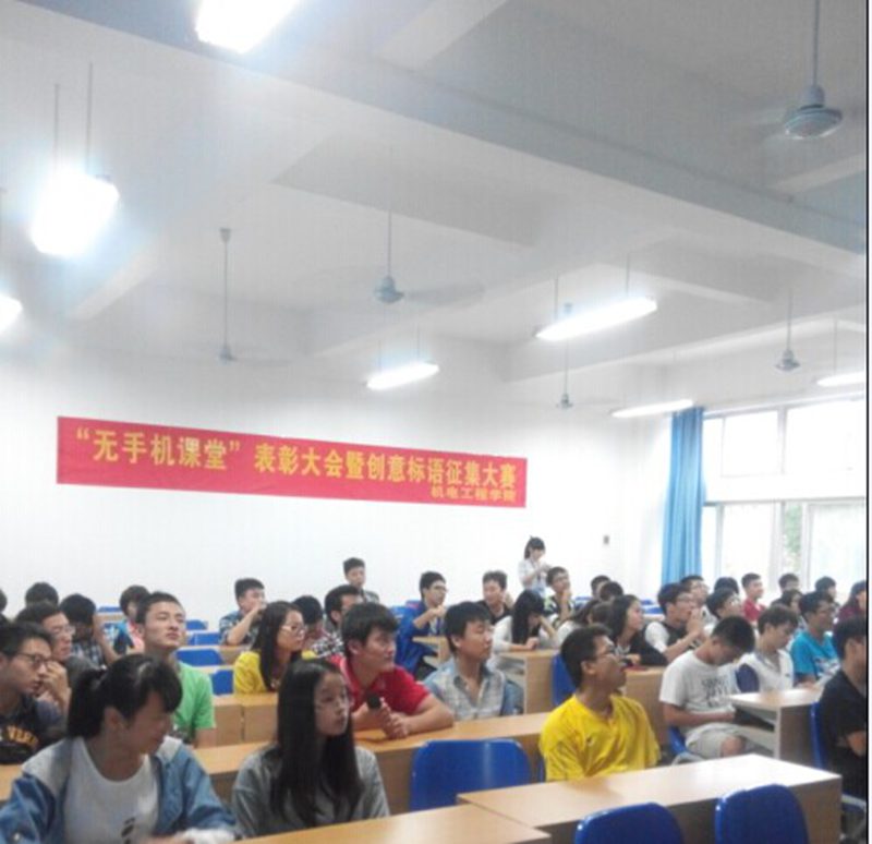 活动共分为四个环节:创意标语征集大赛、科技改变生活、手机进驿站活动的推广和无手机课堂先进班集体颁奖仪式。活动开始,主持人对到场的嘉宾及同学表示热烈的欢迎并详细地介绍了本次活动的流程。在创意标语征集大赛环节,为了保证比赛公平公正,其参评人员由今天到场所有同学共同担任,同学们都认真投入的阅读每一条标语并且给予打分。经过了激烈的评选后,优秀标语脱颖而出,最有文艺范的当属“拿起手机时想想自己高否?帅否?那么现在可以放下否?”在科技改变生活环节,主持人现场为大家播放了两个关于使用手机的视频,视频虽简短,却直截了当的突出手机带给我们的负面影响。在科技高速发展的今天,我们手中使用的手机越来越智能化,智能手机的出现,确实给我们的生活带来了便利,但是同时也给我们带来的一系列危害,它不仅影响休息,贻误学业,最严重的是手机辐射能够严重影响我们的身体健康。在主持人的肺腑之言下,很多员工充分认识到了手机带给我们的危害,纷纷表示将参与手机驿站活动。紧接着辅导员崔建兵老师意味深长的讲话把活动推向了高潮,他希望同学们在以后能够坚持参加此项活动,树立一个好的榜样,顿时场上响起了一阵阵热烈的掌声。最后,伴随着音乐的响起,最令人激动的环节来临,所有人都期待着优秀班集体到底花落谁家,最终机电一班和自动化获得了优秀班集体称号,由崔建兵老师为获得优秀班集体称号的班级颁发奖状。颁奖仪式结束后,同学们进行了横幅签名活动,预示着手机驿站活动又一批新鲜血液的加入。最后伴随着愉悦的氛围,活动渐渐落下了帷幕。