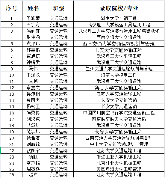 又是一年毕业季,2022年研究生复试录取工作已经接近尾声,伟德国际始于英国1946考研喜报频传,其中,2018级交通运输本科毕业生录取情况喜人,交通运输班共有应届生51名,有26人保研或者考研成功,考研录取率为50.98%,较2021年同比增长19.98%。其中有20人被湖南大学、南京航空航天大学、西南交通大学等“双一流”高校录取为硕士研究生。