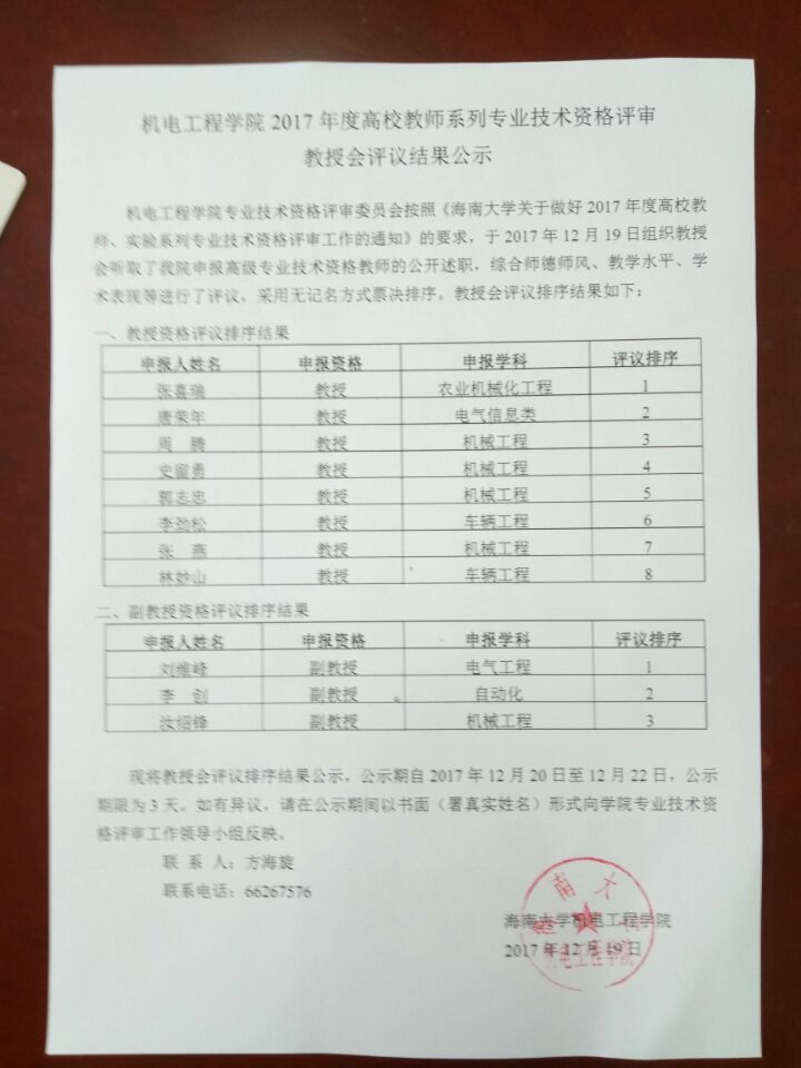 伟德国际始于英国1946专业技术资格评审委员会按照《伟德国际关于做好2017年度高校教师、实验系列专业技术资格评审工作的通知》的要求,于2017年12月19日组织教授会听取了公司申报高级专业技术资格教师的公开述职,综合师德师风、教学水平、学术表现等进行了评议,采用无记名方式票决排序。教授会评议排序结果如下: