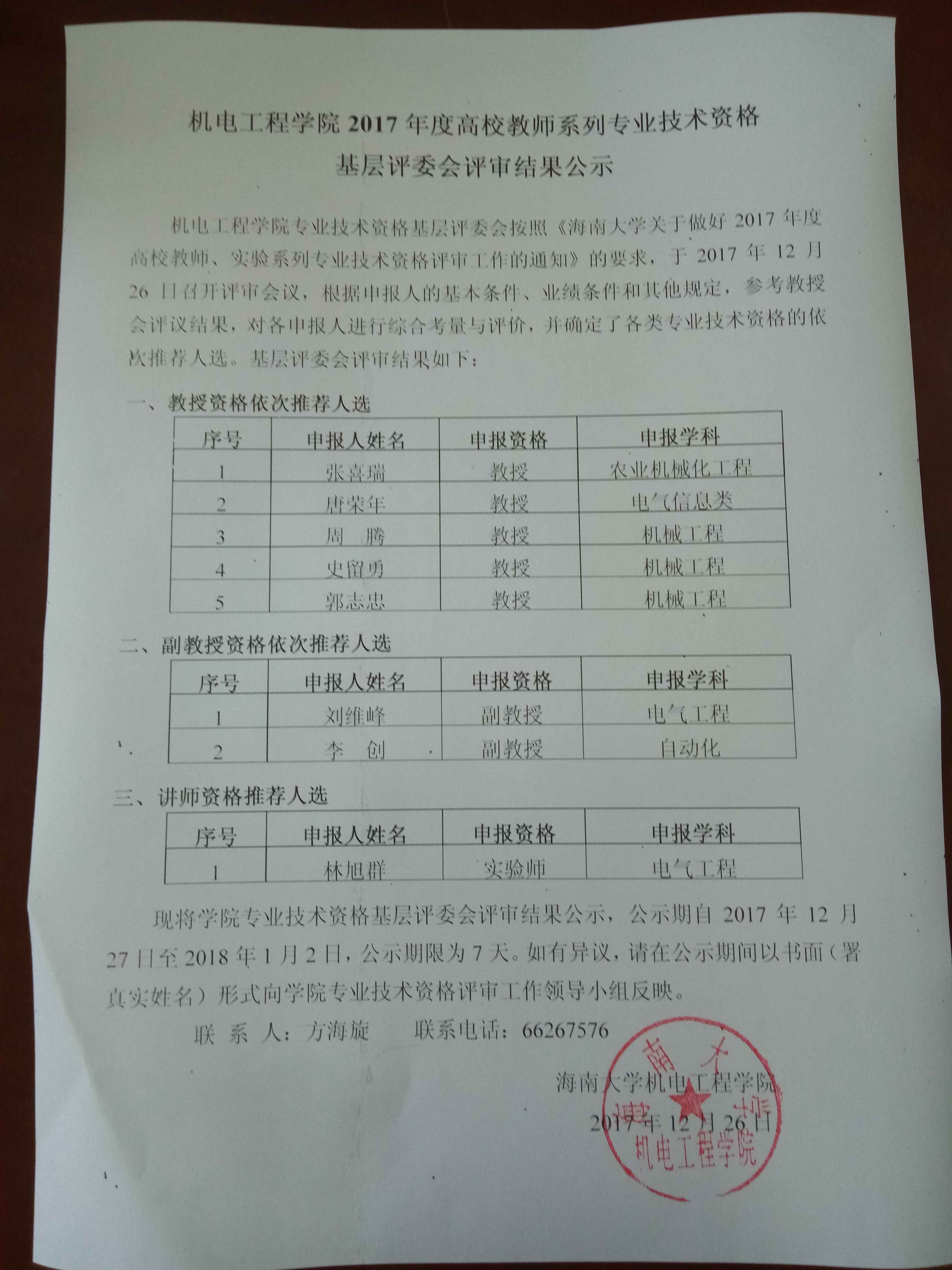 2017年度高校教师系列专业技术资格基层评委会评审结果公示